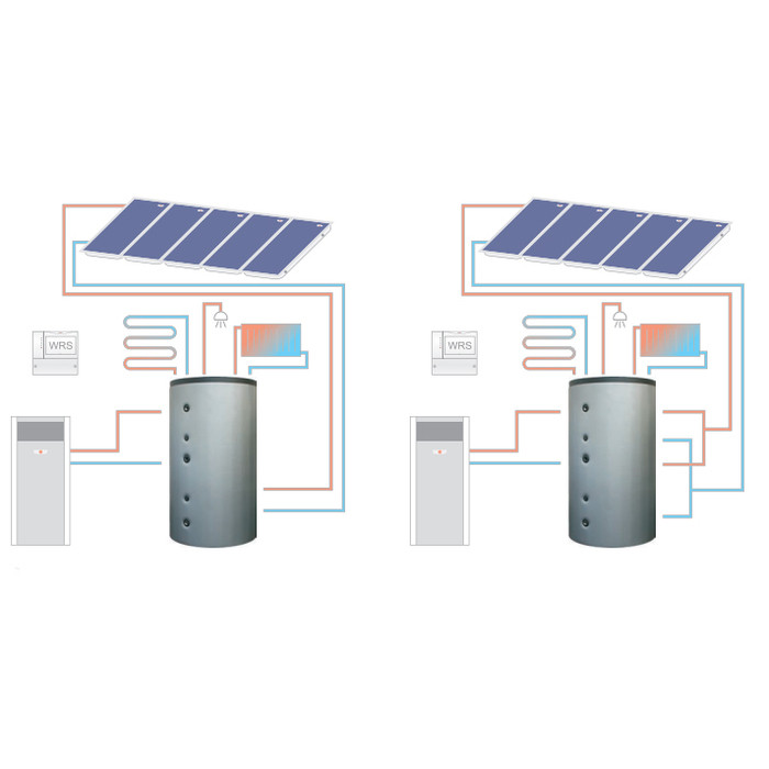 - Бесступенчатая настройка „готового объема бака“ для приготовления горячей воды, благодаря свободному позиционированию датчика температуры на колодке для подключений температурных датчиков и термостатов.