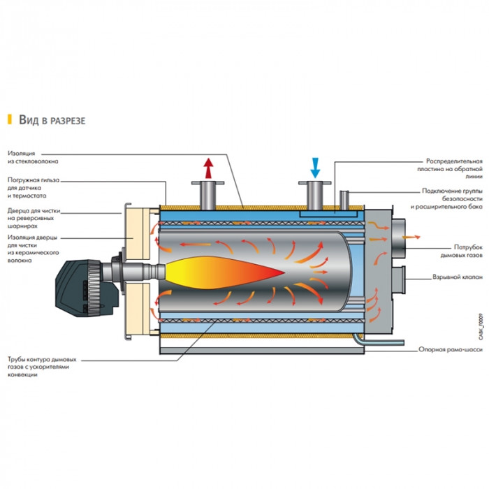 - Конструкция камеры сгорания гарантирует хорошую адаптацию наддувной горелки любого типа, и низкие выбросы NOx