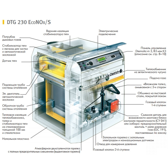 Газовый котел De Dietrich (Де Дитриш) DTG 230-14 S K3 (теплообменник в сборе) отличается высокой производительностью и надежностью. Устройство эффективно справляется со своими обязанностями, создавая комфортный микроклимат в помещении в холодное время года. Для российских пользователей в стандартную комплектацию входит датчик тяги.