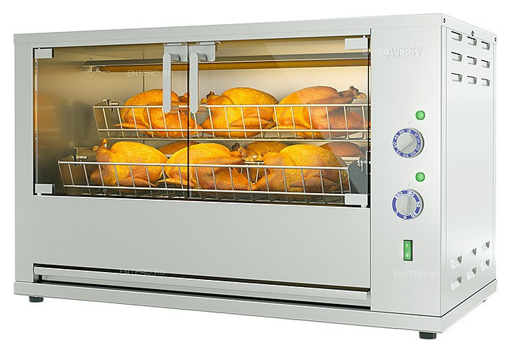 Описание Гриль для кур ATESY Командор-5Э-Т-380 используется на предприятиях общественного питания и торговли для жарки тушек кур, цыплят, куриных окорочков, грудок и других продуктов питания. Модель оснащена 4 легкосъемными садками (люльками), вращающимися вокруг центральной оси внутри рабочей камеры. Корпус выполнен из пищевой нержавеющей стали AISI 430, садки для кур - из нержавеющего прутка, двери - из закаленного термостойкого ударопрочного стекла. Особенности: Позволяет готовить как целые тушки кур, так и их отдельные части Приготовление продуктов осуществляется посредством инфракрасного излучения ТЭНов, расположенных на передней, задней и верхней частях рабочей камеры Каждый ТЭН имеет отражатель, повышающий эффективность нагрева продукта Сочетание скорости вращения и мощности привода обеспечивает качественное приготовление кур при любой (даже несимметричной) загрузке Механизм торможения позволяет четко фиксировать положение садков во время остановки вращения, исключая проворот Интенсивность нагрева плавно регулируется терморегуляторами, ручки которых расположены на передней панели Таймер (до 120 мин.) автоматически отключает нагрев и подает звуковой сигнал по окончании установленного времени Поддон для сбора влаги и жира, стекающего с кур, на дне рабочей камеры Двери фиксируются магнитными защелками в закрытом положении Угол и положение открытых дверей не препятствуют выемке садка с курами Дополнительные характеристики: Количество одновременно загружаемых кур (до 1,2 кг каждая): 12 Количество садков: 4 Время полного оборота садков: 95 сек. Время приготовления при полной загрузке камеры: от 60 до 70 мин. Мощность ТЭНа: 2 кВт Характеристики Тип гриля: карусельный Количество кур: 12 Количество ТЭНов: 3 Температурный режим: от 50 до 250 °С Подключение: электричество Электрическая мощность: 6 кВт Напряжение: 380 В Ширина: 860 мм Глубина: 465 мм Высота: 530 мм Вес (без упаковки): 33 кг Страна-производитель: Россия