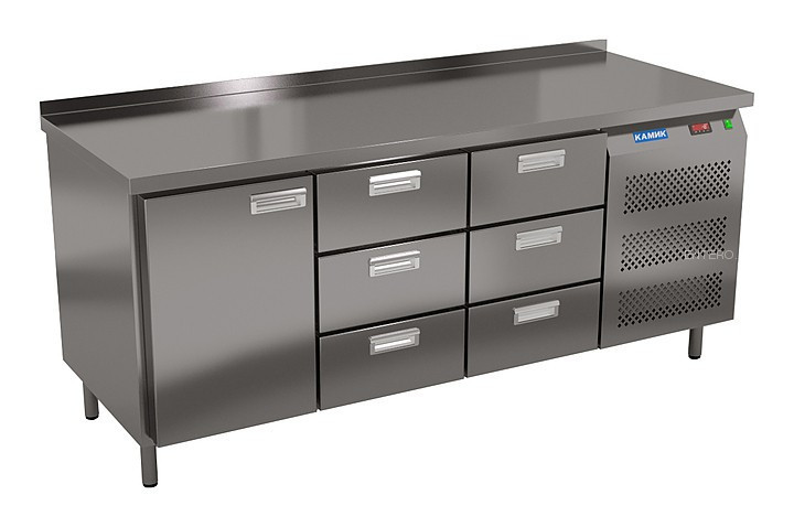 Описание Морозильный стол КАМИК СМ-16236 используется на предприятиях общественного питания и торговли для заморозки и длительного хранения продуктов, полуфабрикатов и мороженого. Конструкция разделена на секции, каждая из которых оборудована сетчатой полкой и парой направляющих. Корпус выполнен из нержавеющей стали AISI 430 толщиной 1 мм, столешница - из нержавеющей стали AISI 304 толщиной 1,5 мм. Особенности: Вентилируемый объем Автоматическая оттайка Двери с доводчиками Дополнительные характеристики: Мощность: 0,8 кВт Характеристики Расположение агрегата: сбоку Температурный режим: от -18 до -10 °С Объем: 512 л Столешница: с бортом Рабочая поверхность: нерж. сталь Количество дверей: 1 Количество ящиков: 6 Напряжение: 220 В Ширина: 2300 мм Глубина: 600 мм Высота: 850 мм Вес (без упаковки): 171 кг Страна-производитель: Россия